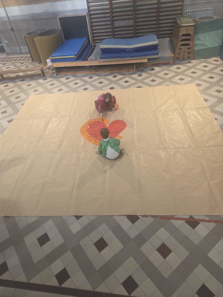 Certains s’entraînent à jouer leur rôle devant les autres, bien concentrés au milieu de la scène. D’autres s’occupent des décors : un immense cœur orange et rouge prend forme sur une grande toile, peint avec soin par de petites mains en tablier. Et puis il y a ceux qui répètent avec leurs accessoires — parapluies, couronnes, épées en bois — déjà dans la peau de leurs personnages.
